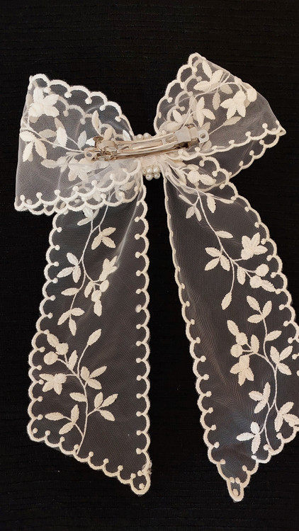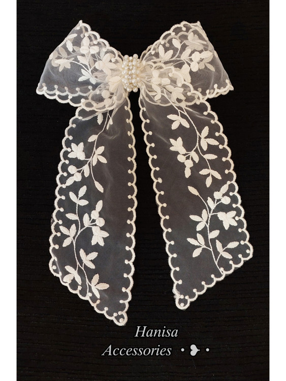 🎀 گلسر پاپیونی با نوار گیپور گلدوزیشده و خرجکار مربعی مرواریدی