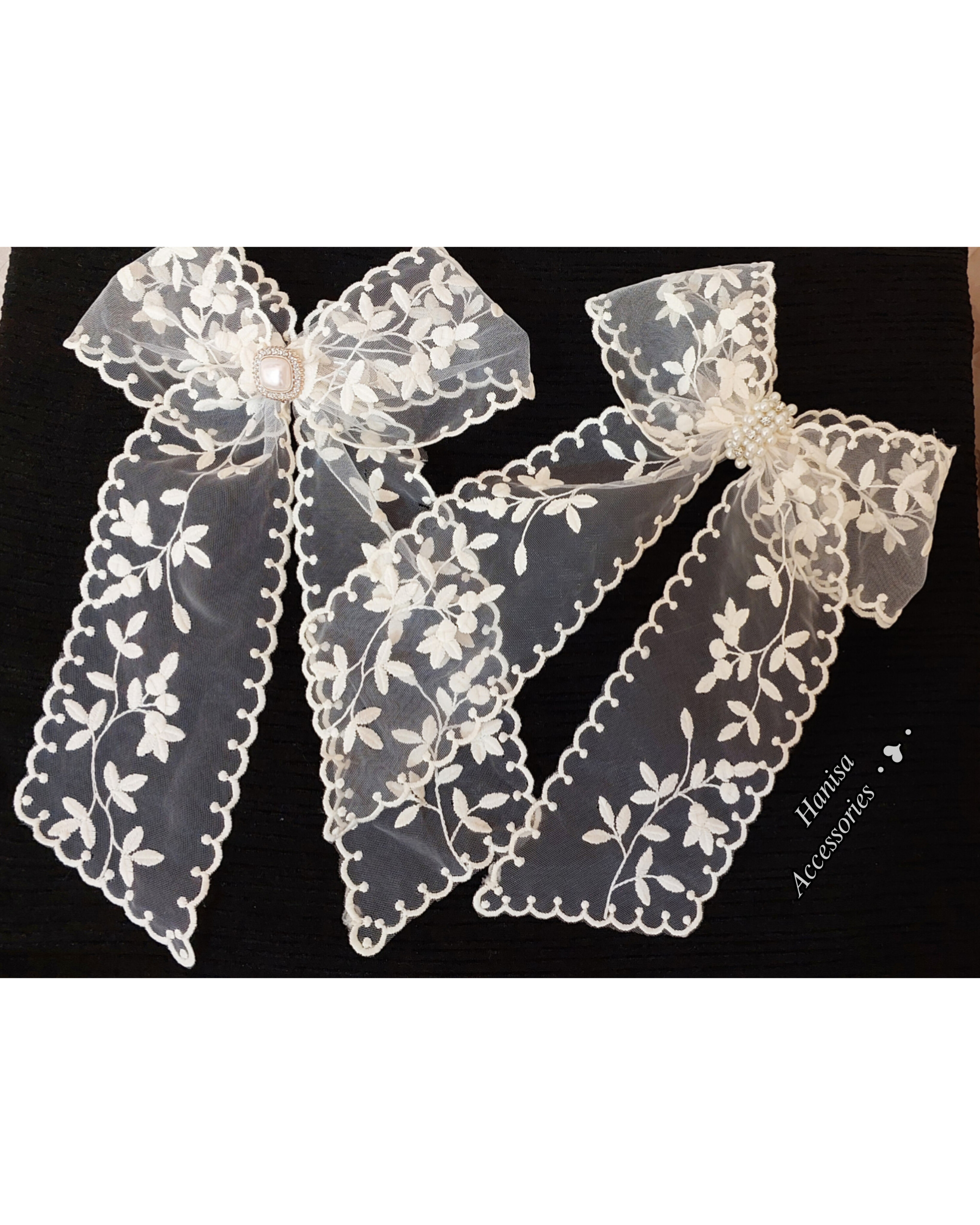 🎀 گلسر پاپیونی با نوار گیپور گلدوزیشده و خرجکار مربعی مرواریدی