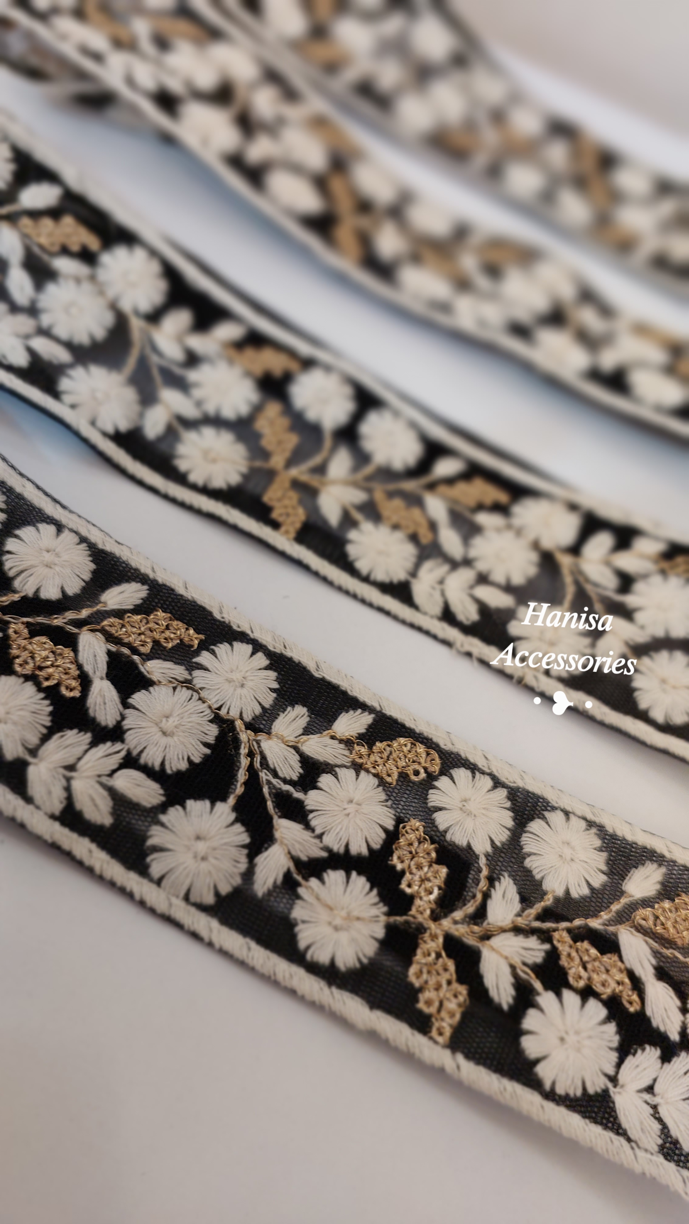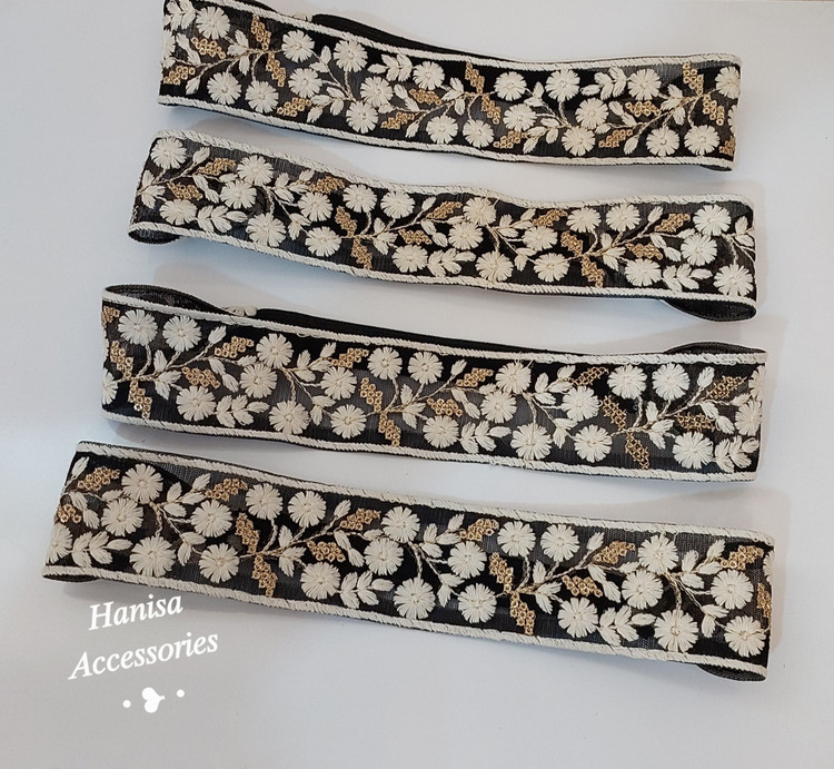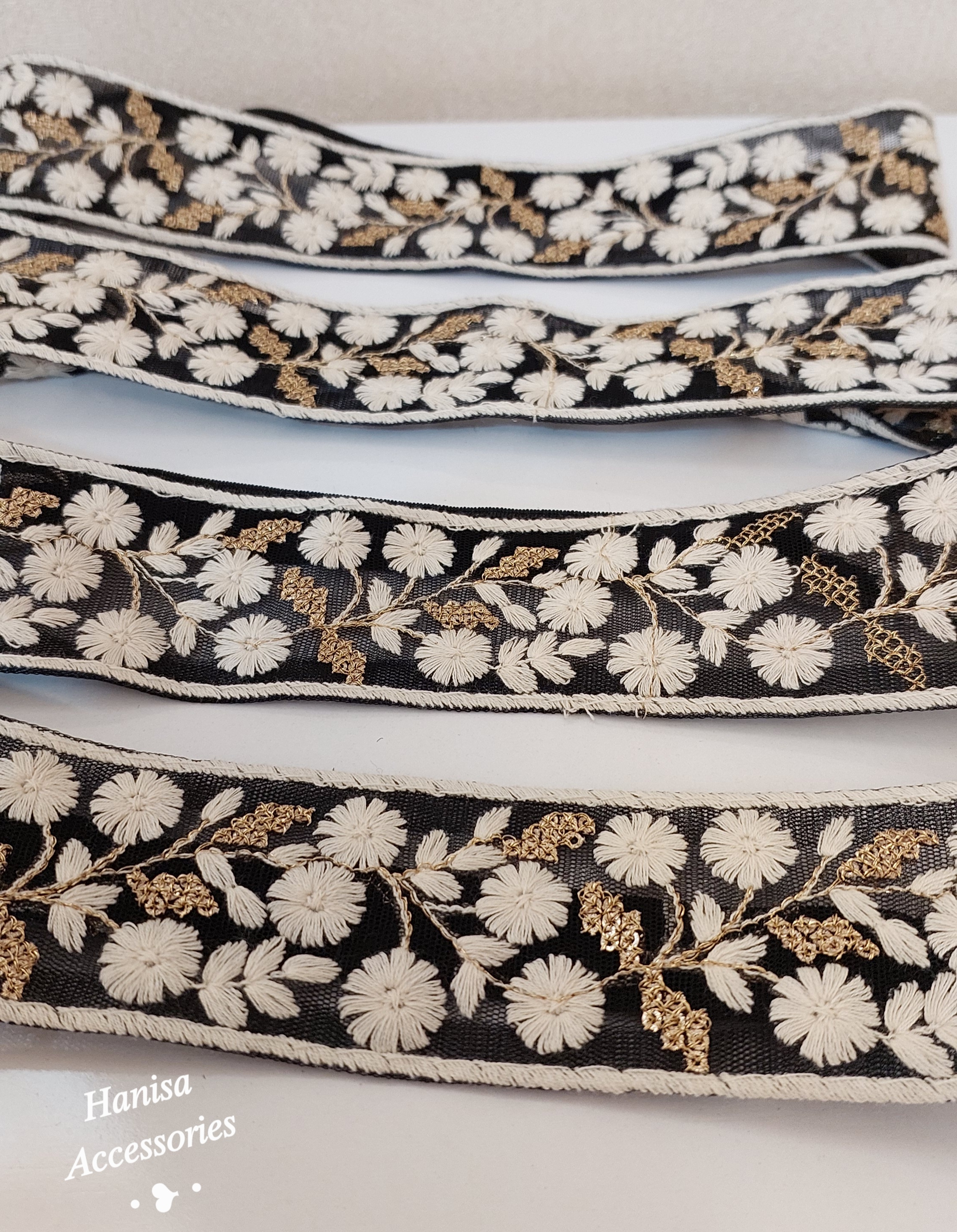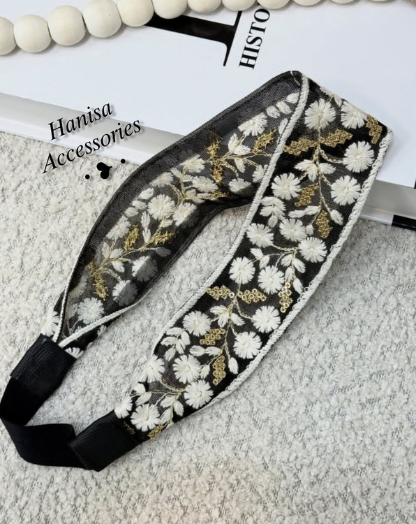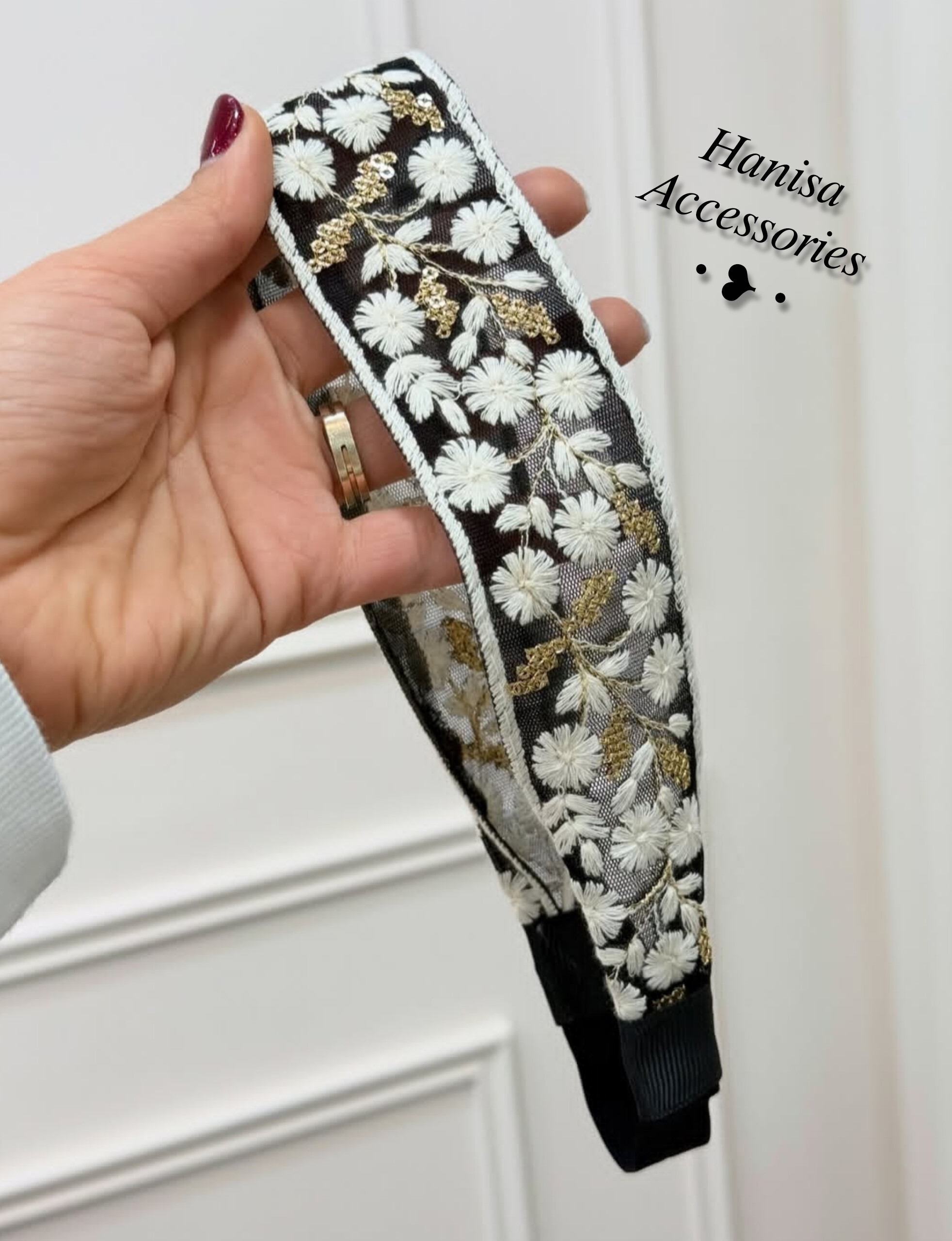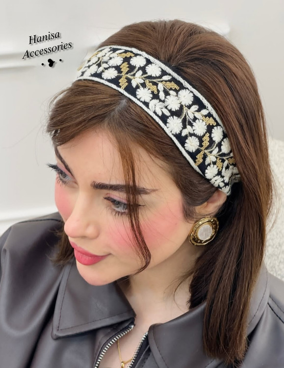 هدبند مشکی گلدوزیشده با طرح گلهای سفید و طلایی، مناسب استایل مجلسی، عکاسی و استفاده روزمره. کیفیت دوخت بالا، سبک و راحت، مناسب انواع مدل مو.