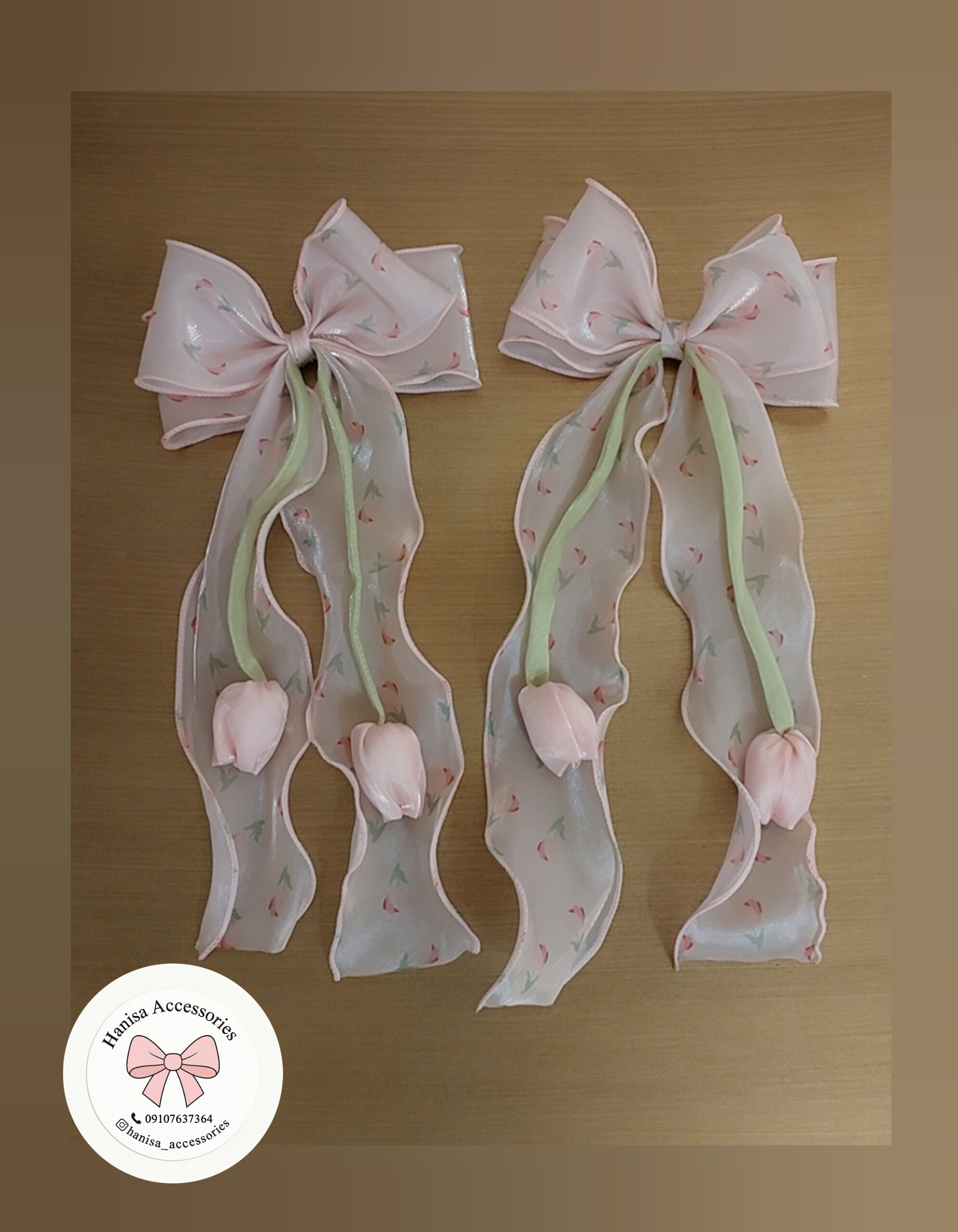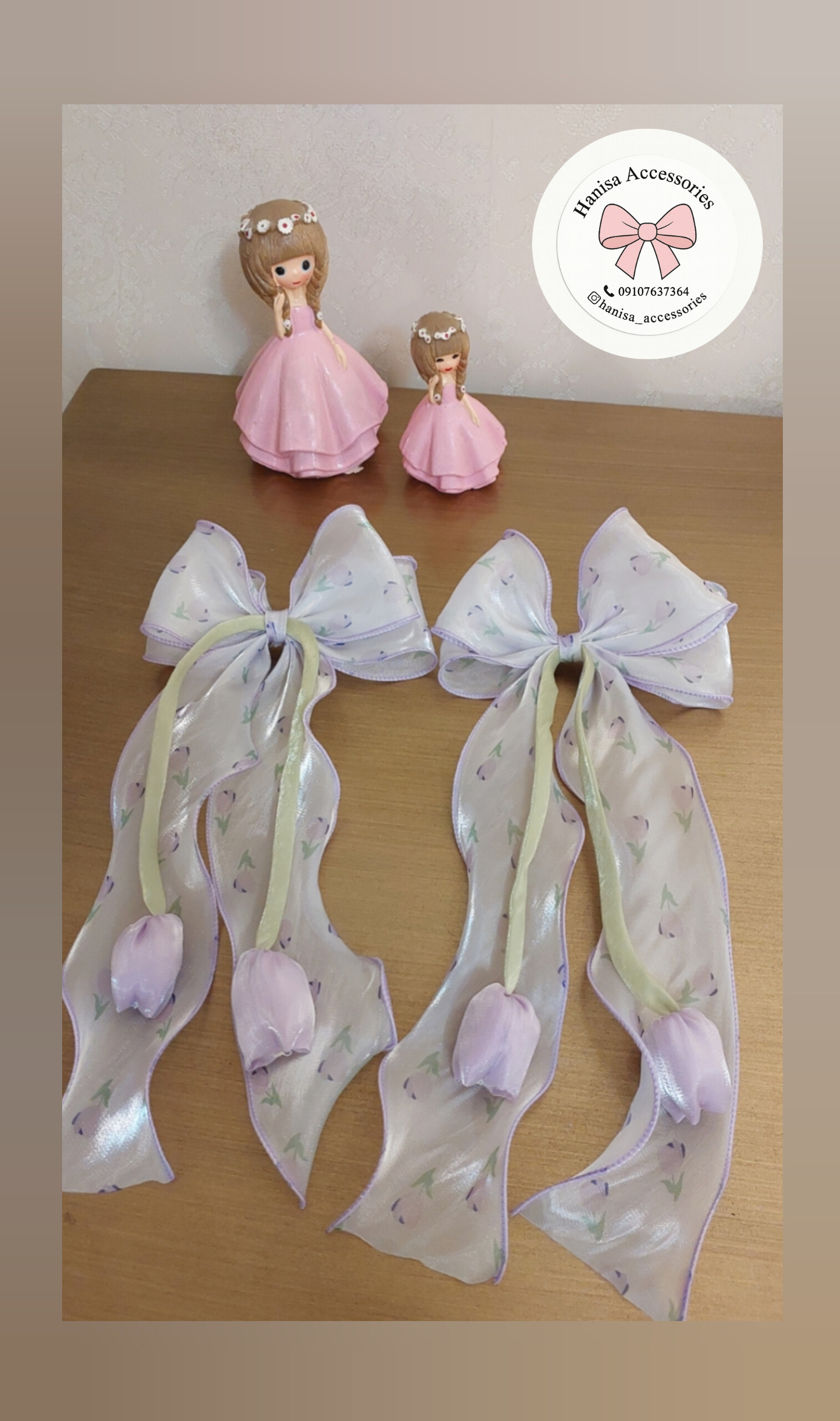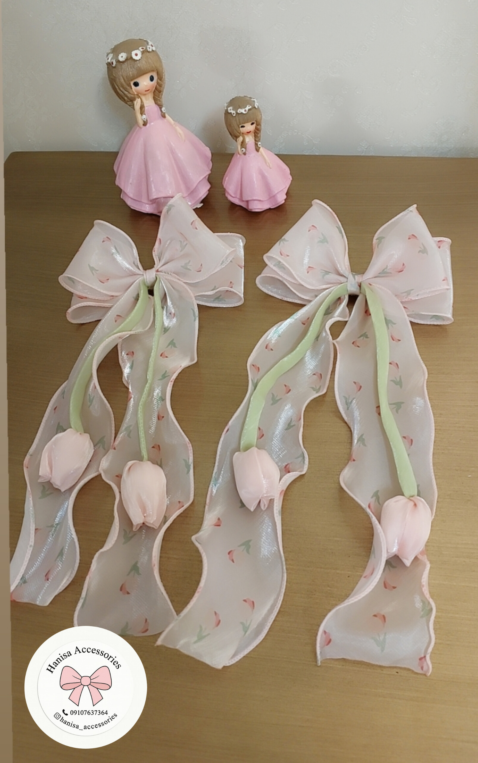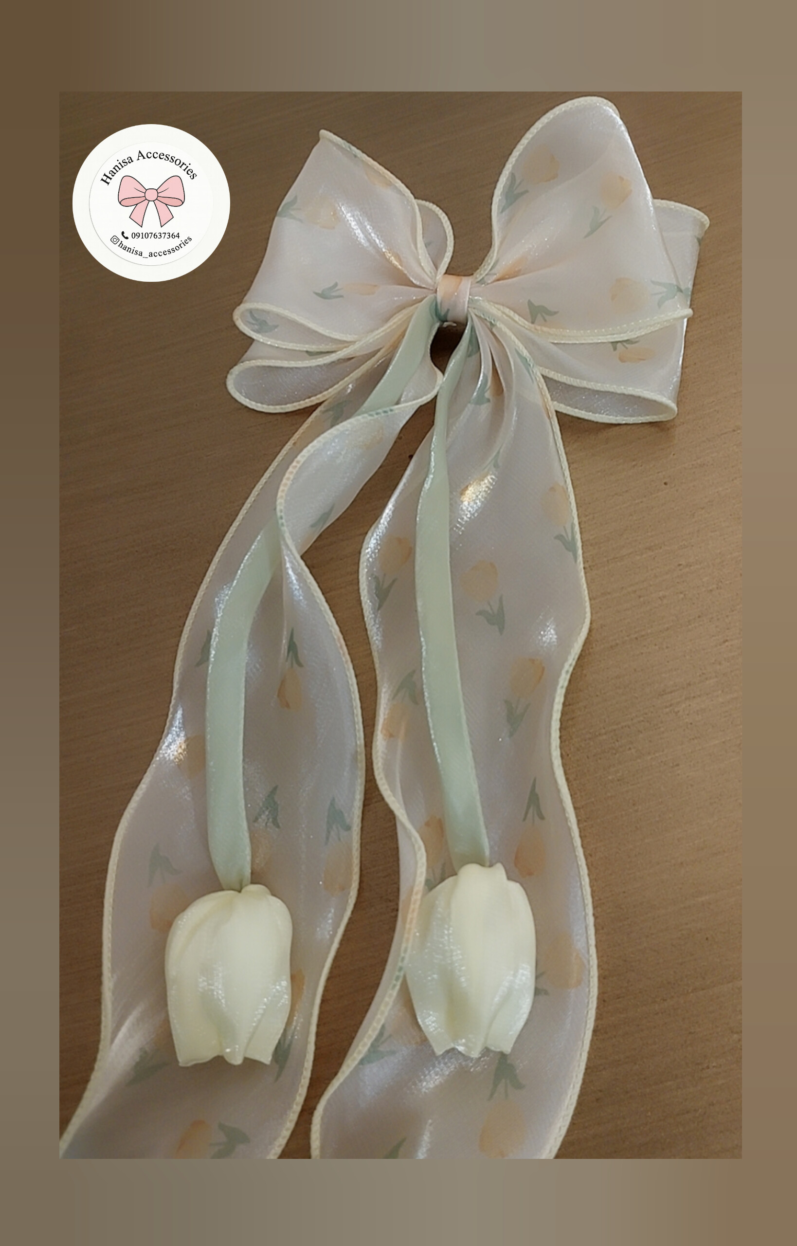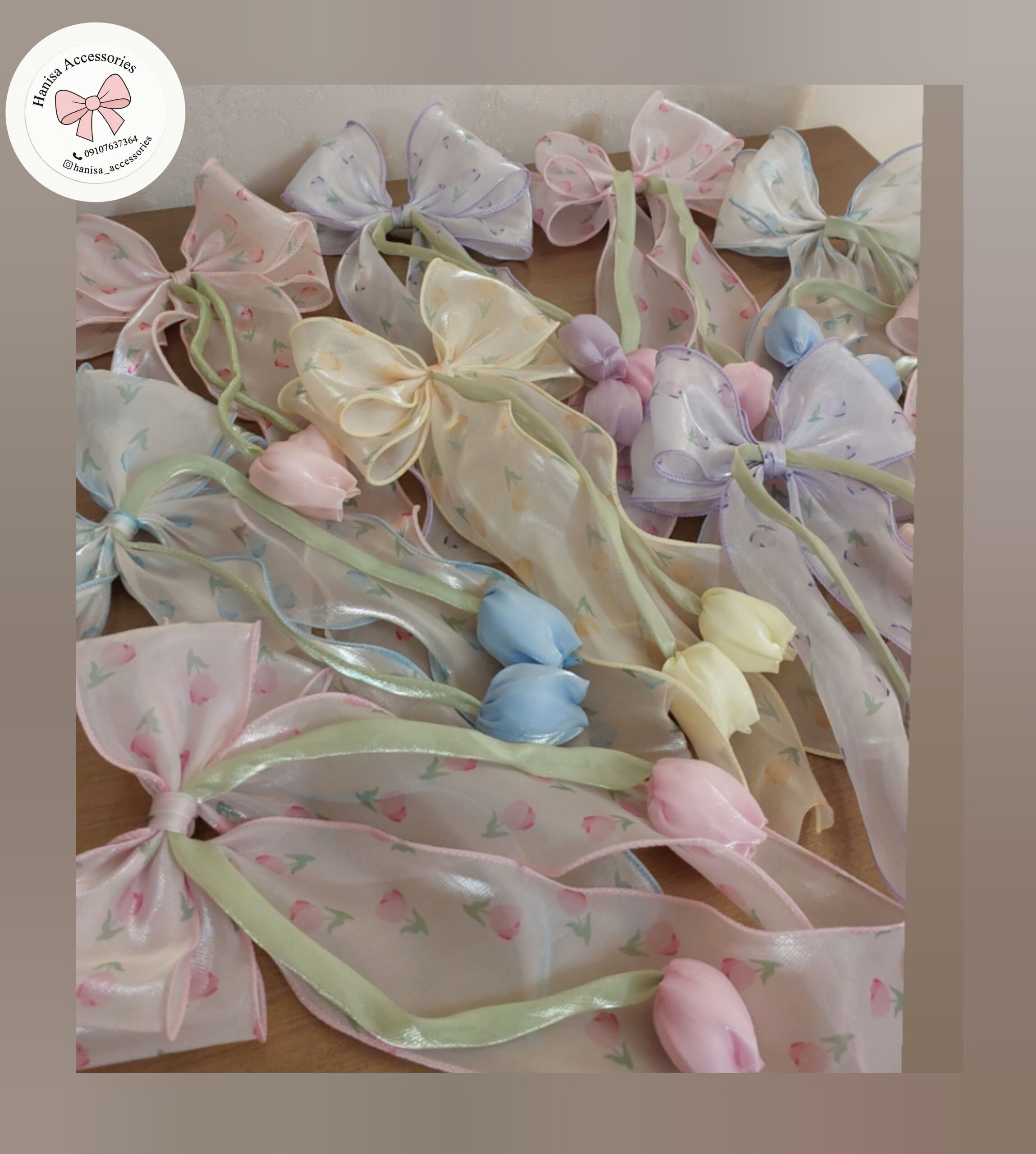 گلسر حریر طرحدار با آویز گل لاله، ترکیبی از شیکپوشی و ظرافت.