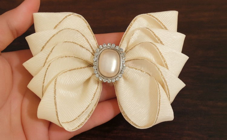 لبههای روبان با نوار طلایی تزئین شدهاند که در نور جلوه خاصی دارند و باعث میشوند گلسر در مهمانیها و عکسها بدرخشد. اتصال آن به مو با کلیپس یا گیره فلزی انجام میشود که محکم و راحت است و بهخوبی روی مو قرار میگیرد.
